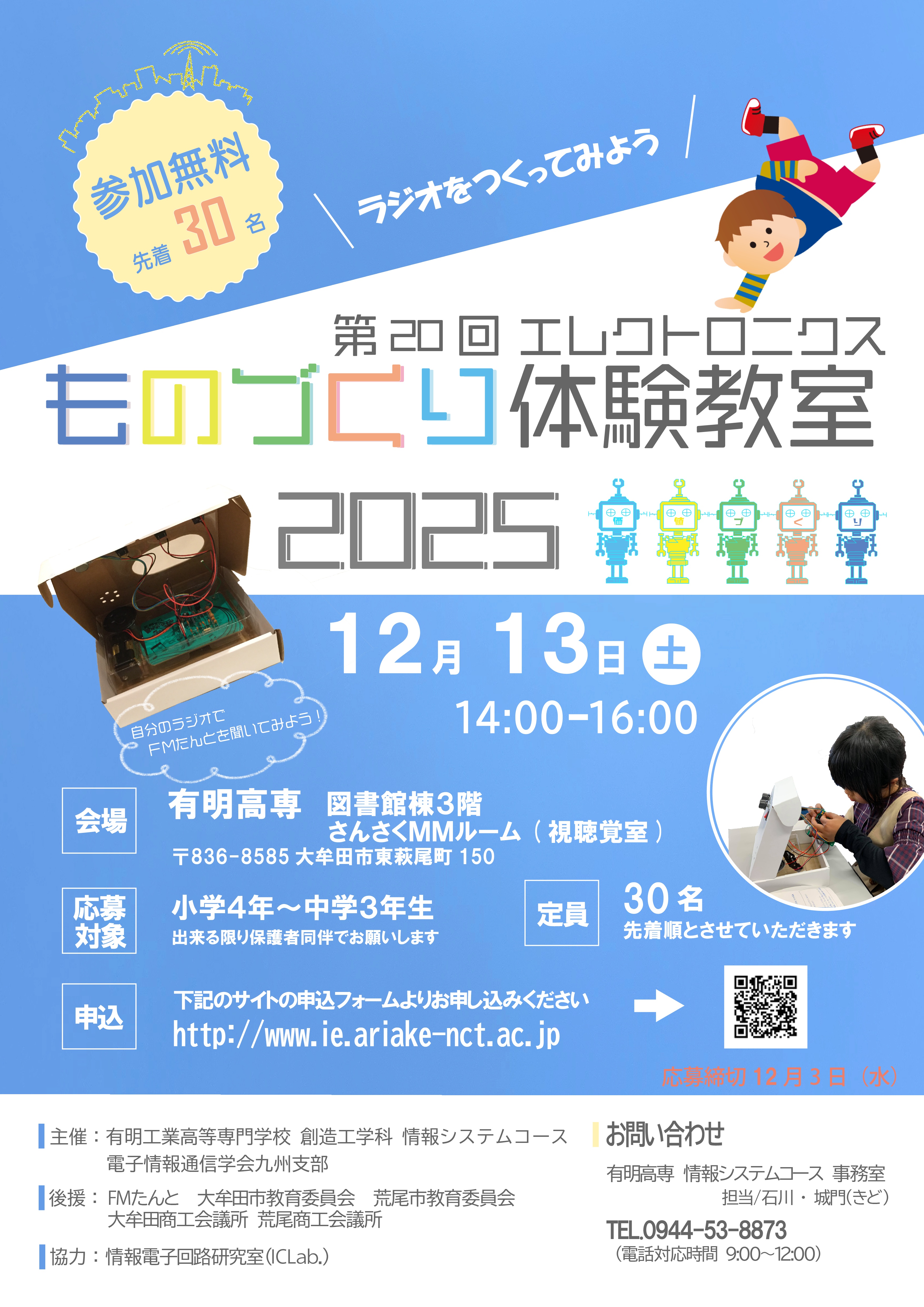 8月23日(火)に「有明高専ものづくり体験教室」を開催致します。※要事前申し込みご参加お待ちしております♪ 下記のアドレスからお申込みください。https://forms.gle/BFPNkbtVxo3CK1zt6事前申 […]