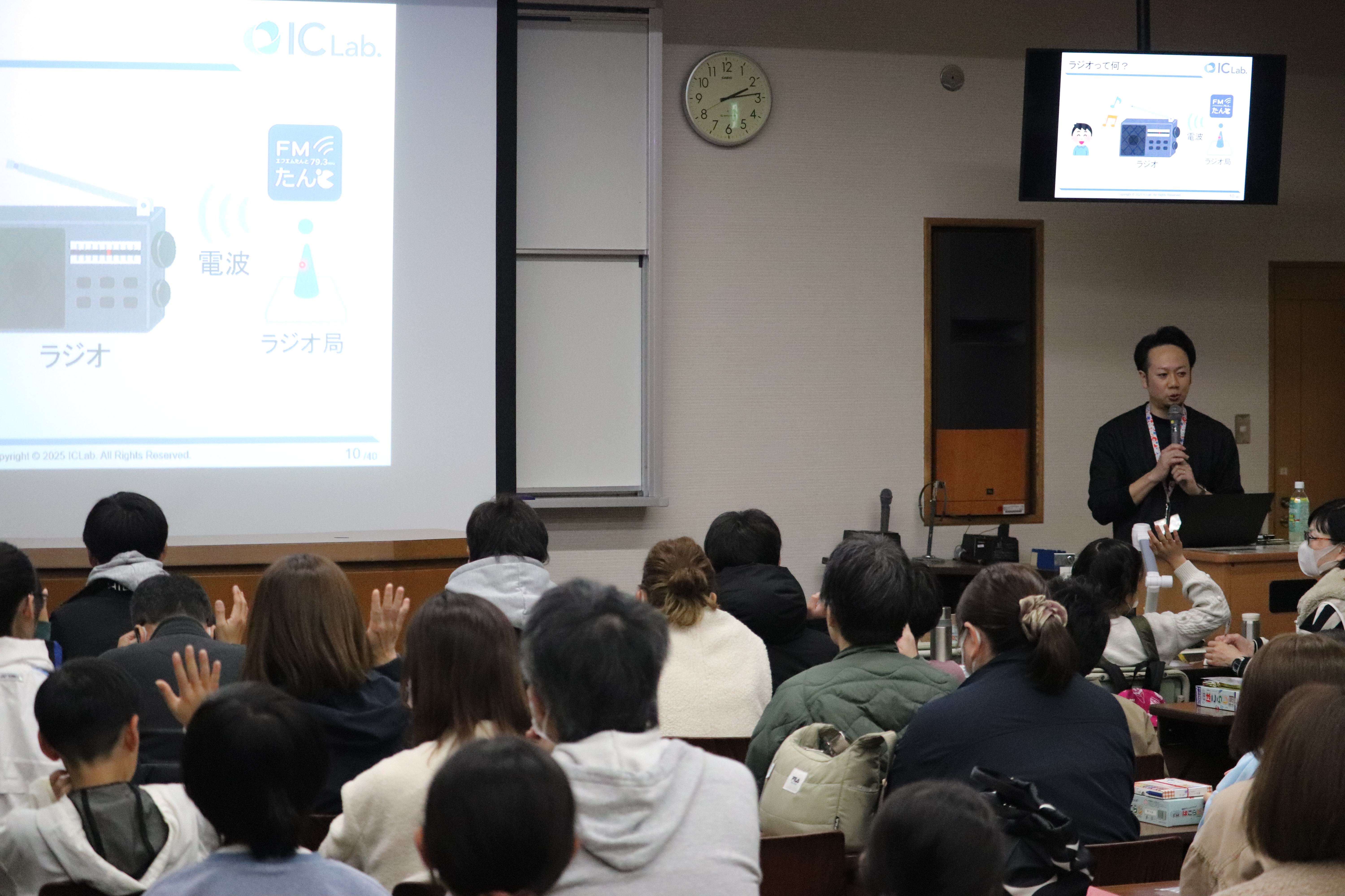 そして引き続き好評のラジオ作成講座!参加者全員で出来上がった自分だけのラジオでFMたんとを聴きました。(防災等の観点で、地元のラジオ局であるFMたんと様にも協賛していただいています。)